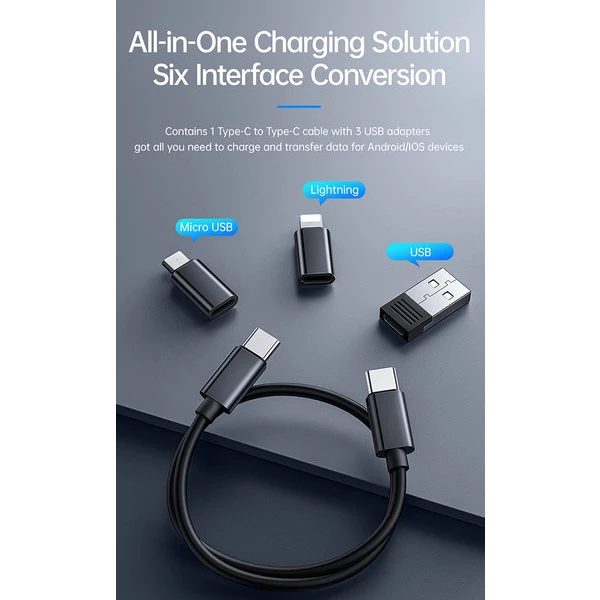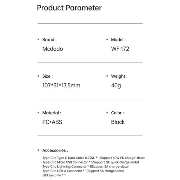 مجموعه کابل چند کاره مک دودو مدل WF-1720 یک راهحل جامع برای شارژ و انتقال داده بین دستگاههای مختلف است. این مجموعه شامل یک کابل تایپ C به تایپ C به طول ۳۰ سانتیمتر و سه مبدل برای تبدیل به لایتنینگ، میکرو USB و USB-A است.