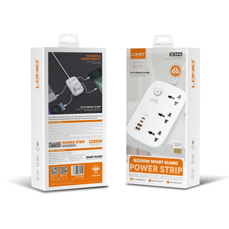 چندراهی برق الدینیو مدل SC3416 ظرفیت ۳۲۵۰ وات با ۳ سوکت و ۲ متر کابل